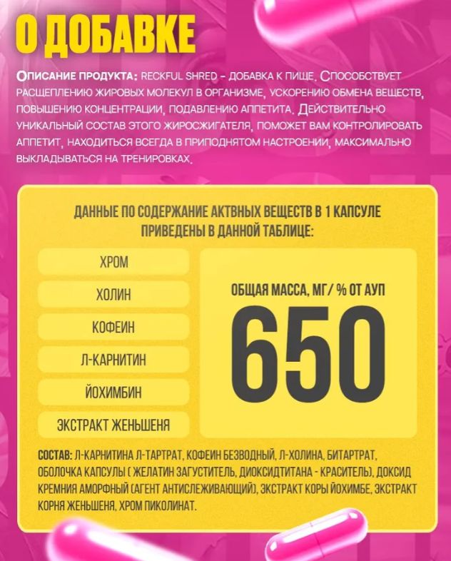 Reckful Shred - добавка к пище способствует ращеплению жировых молекул в организме, ускорению обмена веществ, повышению концентрации, подавлению аппетита, действительно уникальный состав этого жиросжигателя поможет вам контролировать аппетит, находиться всегда в приподнятом настроении, максимально выкладываться на тренировках.