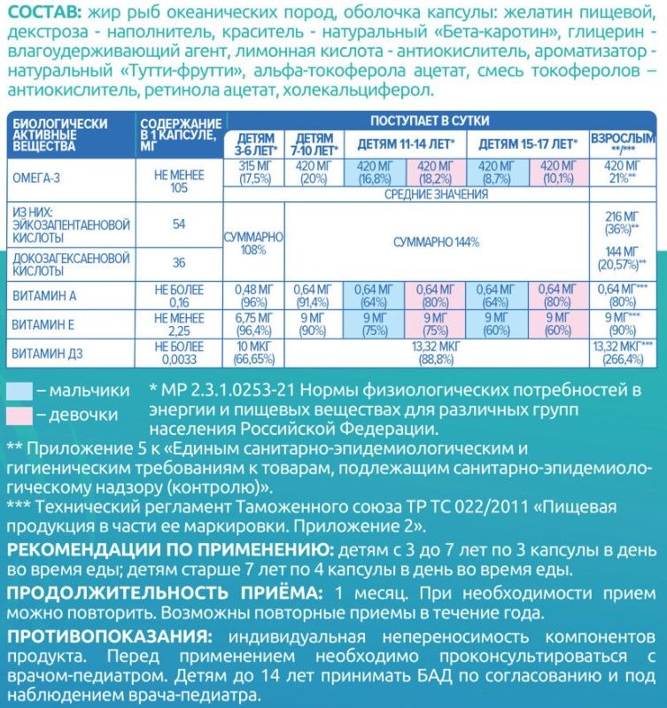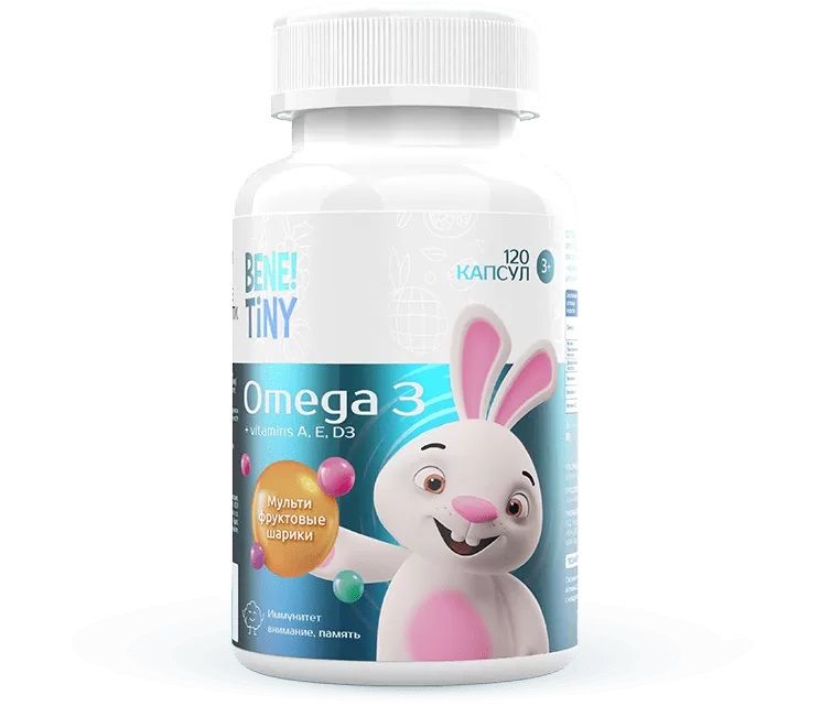 Жирные кислоты Omega-3 являются строительным материалом для клеточных мембран головного мозга и сетчатки глаз, который способен улучшать функционирование органов зрения, умственное развитие и память у детей. Способствует укреплению иммунитета и является важным компонентом системы защиты организма. Наша «Omega-3» помимо оптимального содержания полинасыщенных жирных кислот, обогащена витаминами: A, E, D3, что несёт большую биологическую ценность. Также наша Omega-3 имеет самый уникальный вкус «Тутти Фрутти», который понравится даже самому капризному малышу.