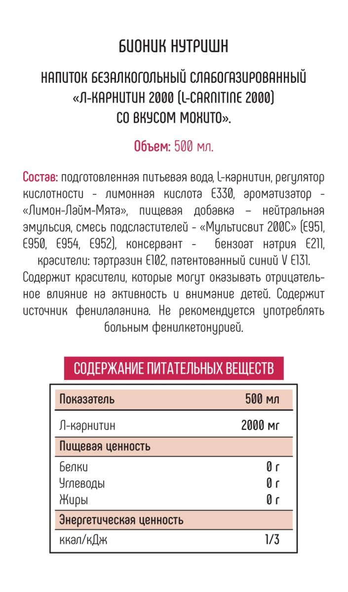 Ингредиенты: вода подготовленная, аминокислота л-карнитин, регулятор кислотности лимонная кислота, ароматизатор, консерванты (сорбат калия, бензонат натрия), аскорбиновая кислота (витамин С), подсластитель сукралоза.