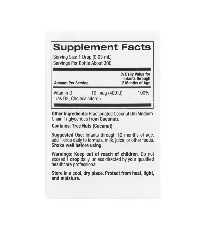 В составе содержится только витамин D3 и кокосовое масло для лучшего усвоения организмом, так как это жирорастворимый витамин. Такой состав минимизирует проявление аллергии у ребенка.
