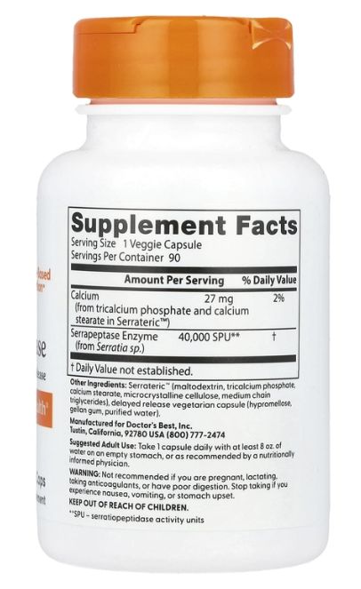 Серрапептаза от Doctor's Best содержит — высокоэффективный состав с кишечнорастворимым покрытием, которое защищает отдельные ферменты до тех пор, пока они не достигнут кишечника, обеспечивая оптимальное всасывание.