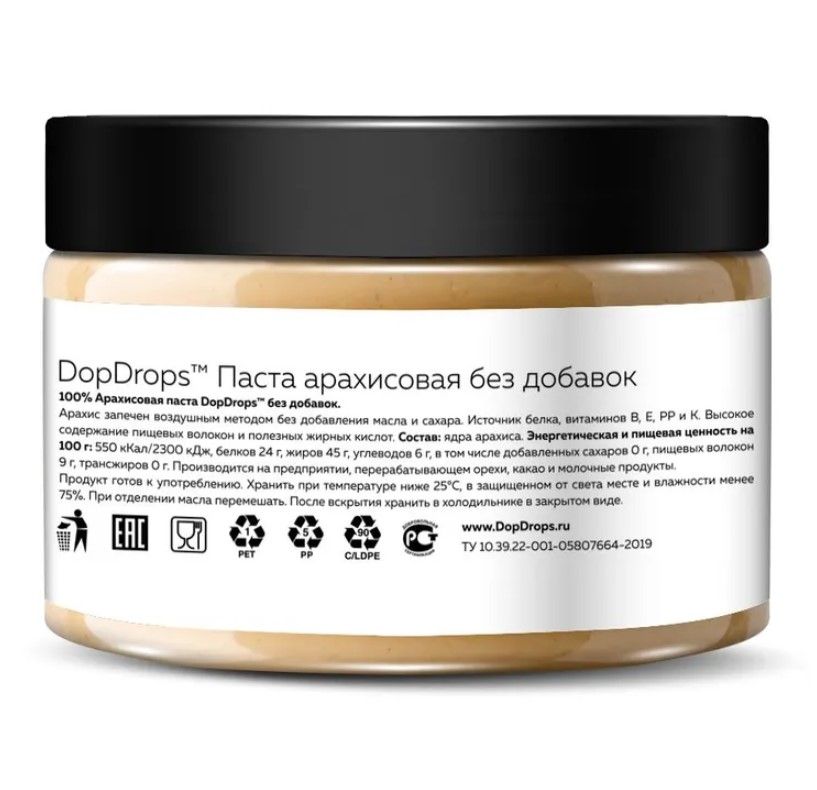 Эта Арахисовая Паста фирменного помола DopDrops с натуральной гималайской розовой солью отличается мягким соленым вкусом. В составе только арахис, запеченный воздущным методом, и небольшое количество натуральной гималайской соли. Прекрасное дополнение к овощным, мясным и сырным закускам.