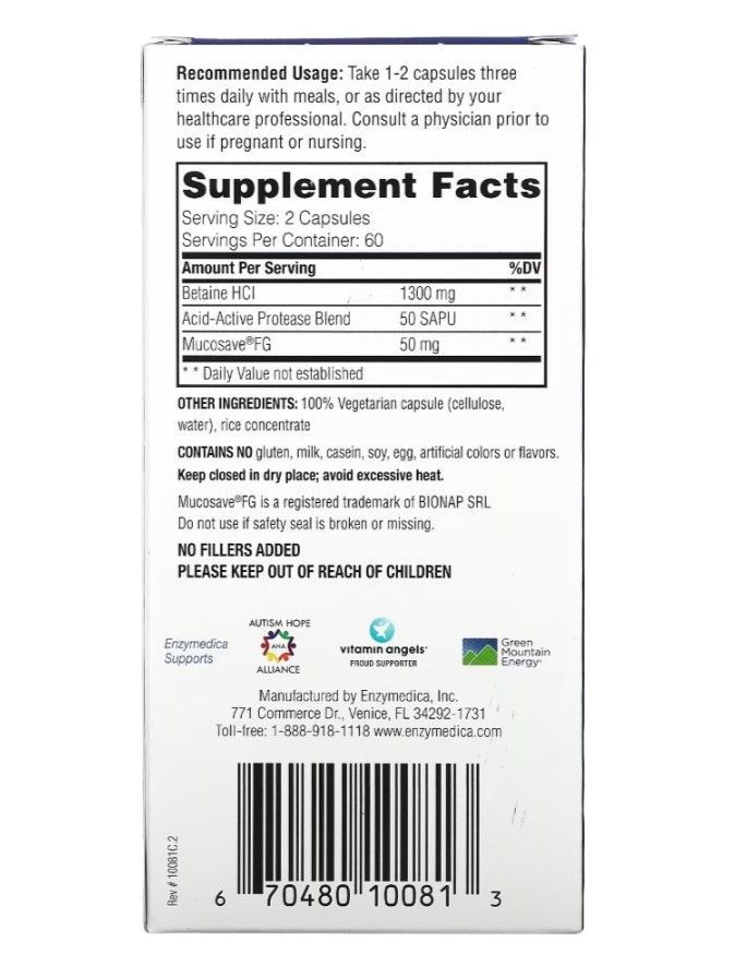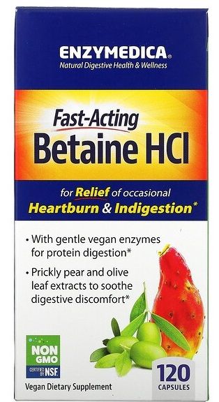 «Бетаин гидрохлорид от Enzymedica обеспечивает мягкую поддержку уровня кислоты для сбалансированного состояния желудка, а также ускоряет пищеварение с помощью нужного количества ферментов, переваривающих белок».