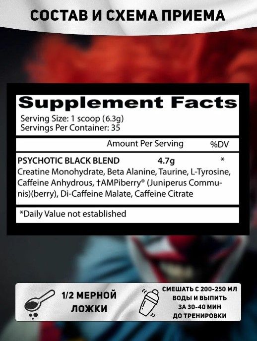 Рекомендации по применению: начать прием с 1/2 мерной ложки для оценки толерантности к стимуляторам. В дальнейшем 1 мерный черпак смешать с 200 - 300 мл воды и выпить за 15 - 30 минут до тренировки.