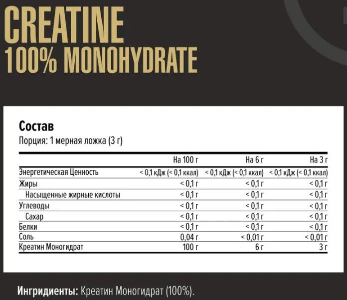 Creatine - это 100% креатин моногидрат в порошковой форме. Креатин моногидрат - это самая распространенная форма креатина. Такая форма имеет максимальное содержание креатина (88%), обладает стабильностью при хранении и термоустойчивостью, не имеет вкуса.