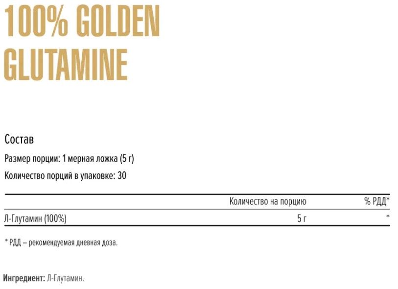 Основной ингредиент Golden Glutamine – L-глютамин, который составляет 60% от общего количества аминокислот в мышцах. Он используется белыми кровяными тельцами в качестве источника топлива и поддерживает целостность слизистой оболочки кишечника.