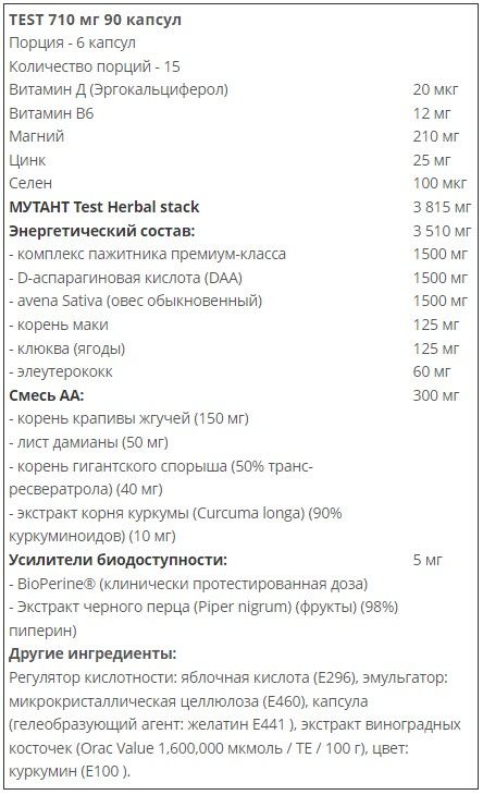 Особенностью продукта Mutant Test является способность стимулировать работу множества физиологических механизмов, способствующих подъему и поддержанию уровня собственного тестостерона, что приводит к ускоренному росту мышечной массы!