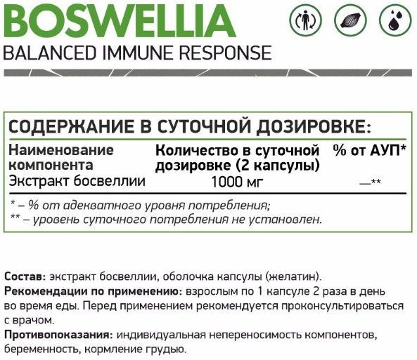 Босвеллия (Боссвеллиа или Масло ладана) - общее название смолистых экстрактов, полученных из деревьев рода Boswelliа. Смола содержит около 10% чистых эфирных масел, состоящих из терпенов и терпеновых кислот. В экстракте также обнаружены четыре уникальных пентациклиновых кислоты, так называемые – «босвеллиевые кислоты» - мощные ингибиторы ферментов, вызывающих воспалительные процессы.