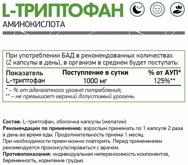 L – Триптофан — это незаменимая аминокислота, из которой синтезируются витамин В и серотонин, также необходима для создания протеинов, содержится в белковой пище.