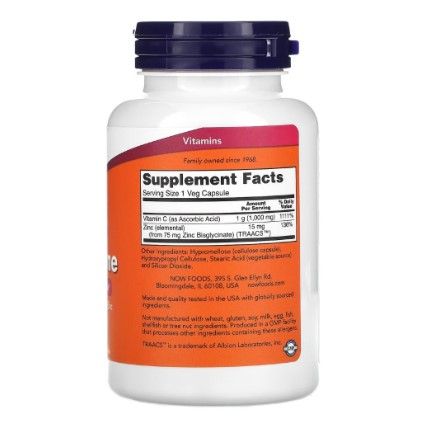 NOW C-1000 + Zinc Immune – это эффективный способ поддержать иммунную систему, улучшить состояние кожи и общую жизненную энергию благодаря комбинации витамина C и цинка.