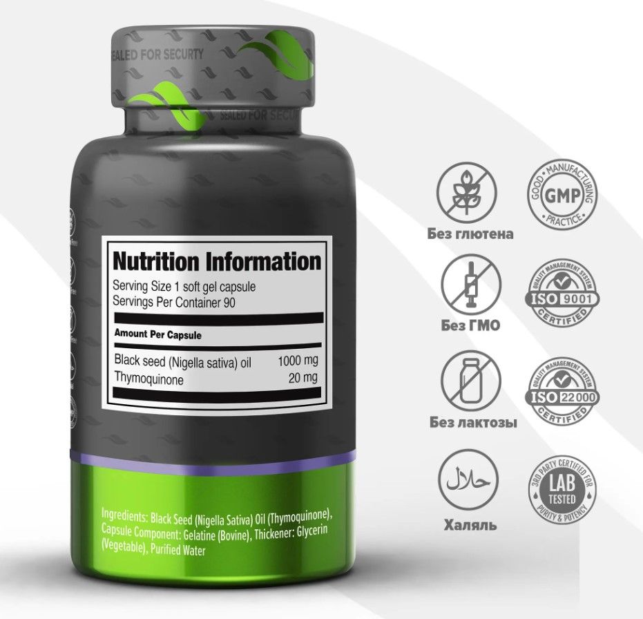 У данной добавки очень удобная и экономичная форма: в банке 90 мини-капсул в мягкой желатиновой оболочке. В составе нет сахара, красителей, консервантов, ароматизаторов, глютена. Состав: масло чёрного тмина, желатин, глицерин и очищенная вода.