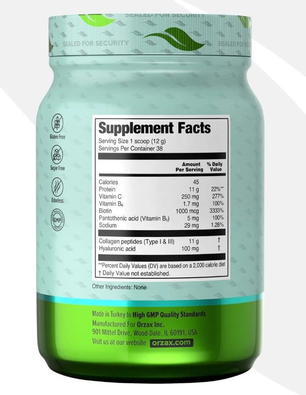 Orzax collagen peptides содержит высококачественные гидролизованные коллагеновые пептиды типа I и III, полученные из крупного рогатого скота, выращиваемого на траве и пастбищах, а так же является источником дополнительных витаминов и аминокислот улучшающих усвоение коллагена, такие как: витамин С, биотин и т.д.