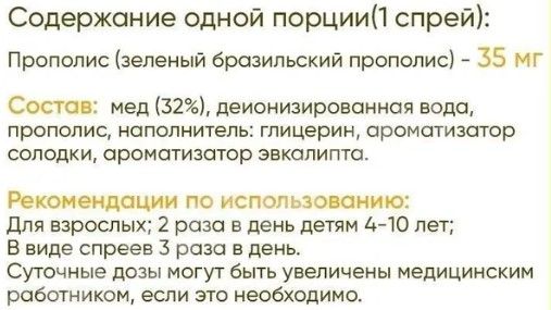 Propolis Spray имеет легкую и удобную упаковку объемом 20 миллилитров, что делает его идеальным для использования дома или в путешествиях. Просто нажмите на кнопку и равномерно распылите спрей на нужную область кожи или слизистых.