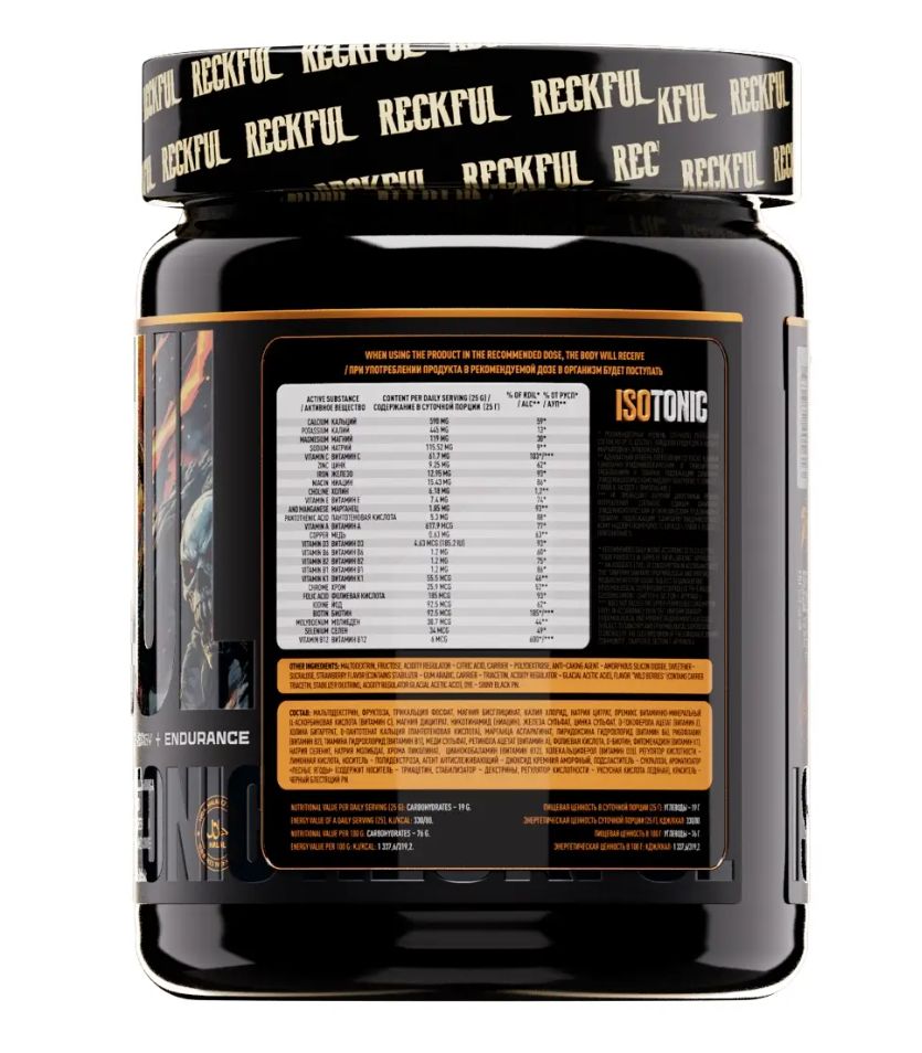 Формула Reckful Isotonic содержит оптимальное сочетание углеводов, витаминов и минералов. Углеводы (глюкоза, фруктоза, мальтодекстрин) обеспечивают быстрое поступление энергии, а комплекс электролитов – натрий, калий, магний, кальций – помогает удерживать воду в организме, предотвращает обезвоживание и поддерживает нормальную работу мышц.