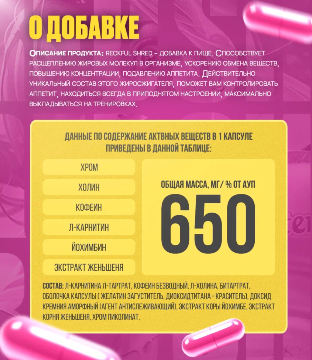 Мечтаешь о подтянутой фигуре и плоском животе? RECKFUL SHRED – это жиросжигатель, разработанный для активных девушек, которые хотят ускорить процесс похудения без потери энергии и хорошего настроения.