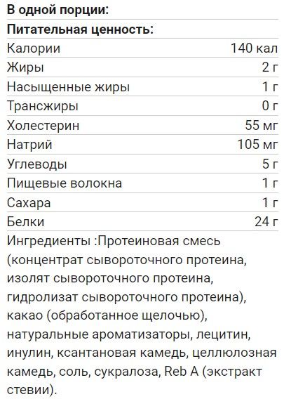 Каждая порция продукта представляет собой высококачественную смесь из трех быстроусвояемых, качественных и максимально эффективных форм белка, а именно изолята, гидролизата и концентрата сывороточного протеина.