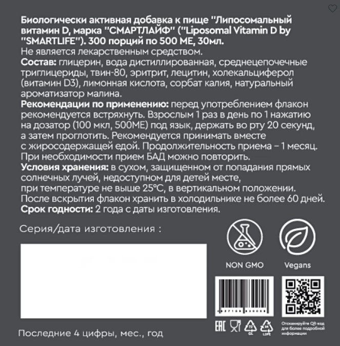 Витамин Д3 холекальциферол, вода, полисорбат, среднецепочечные триглицериды, холекальциферол, эритритол, ароматизатор натуральный малина, лецитин подсолнечный, сорбат
