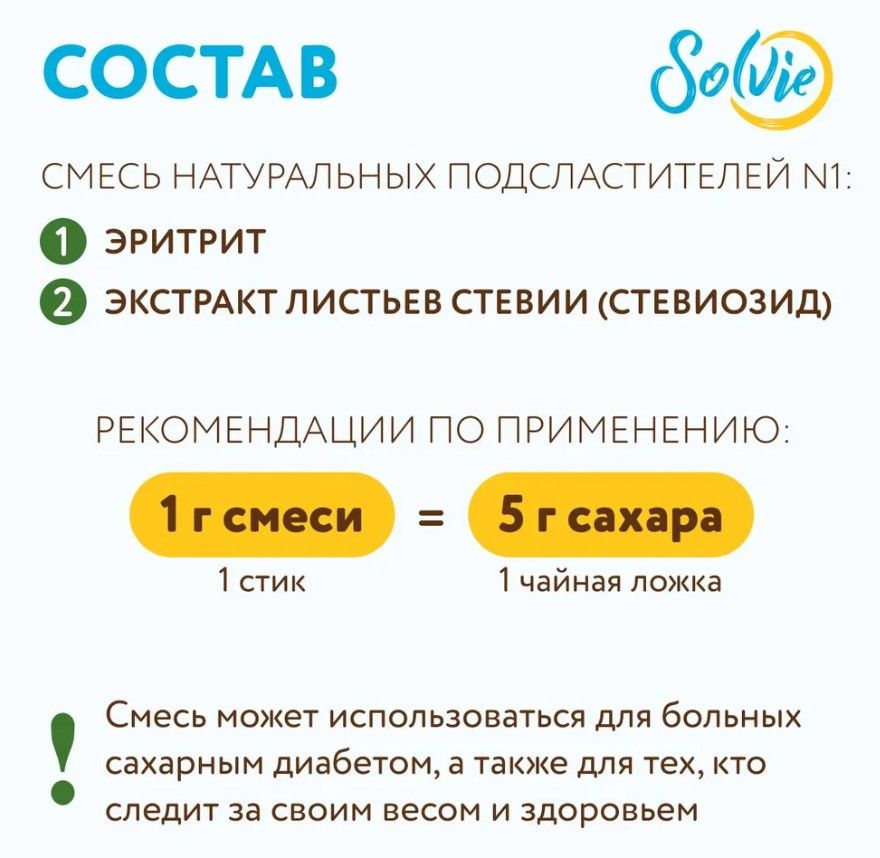 Sweetener от французского бренда Solvie - это сахарозаменитель с натуральным составом. Заменитель сахара содержит эритрит и экстракт из листьев растения.