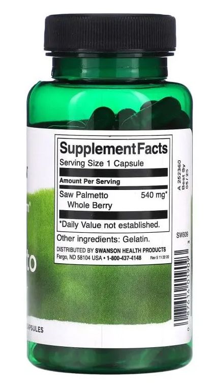 Лидирующая в мире трава для здоровья мужчин Swanson Saw Palmetto является источником жирных кислот и стеролов, которые обеспечивают ценную питательную поддержку простаты. Наши капсулы со пальметто содержат 540 мг порошка из цельных ягод премиум-класса в формате полного спектра, поэтому вы получаете все составляющие пальметто, такие же, как и в природе. Он способствует укреплению волос и повышению их густоты, уменьшает появление прыщей и положительно влияет на состояние простаты (простаты). Повышает либидо!