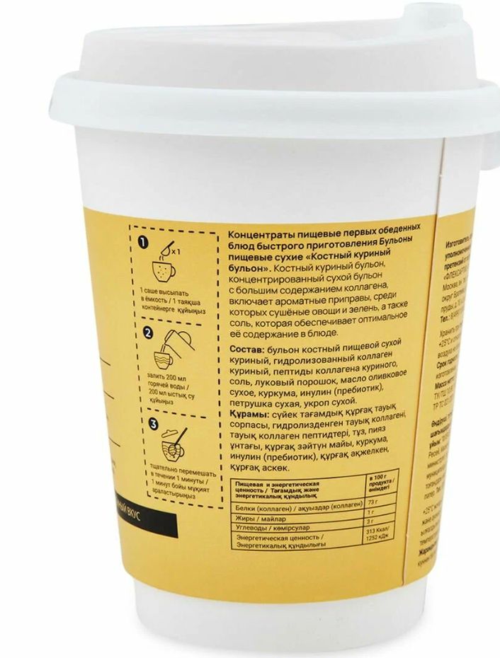 Куриный бульон получается прозрачным, ароматным, с насыщенным вкусом. Питьевой бульон быстрого приготовления содержит гидролизованный коллаген тип 2(II), лучше всего усваивается именно в натуральной форме, в составе более 20 аминокислот. Является отличным источником белка, строительным материалом для соединительной ткани сухожилий, связок, хрящей, отвечает за их прочность и эластичность, улучшает подвижность суставов, повышает качество жизни. В бульоне практически нет углеводов, минимум калорий, что способствует быстрому насыщению и продолжительному чувству сытости, подходит для низкоуглеводных диет, похудения. Ароматный, легкий, с насыщенным вкусом бульон - суп может быть как самостоятельным блюдом, так и прекрасной основой для супов или дополнением к другим продуктам. Употребляйте бульон с приправами, хлебными гренками, как обычный куриный бульон. Используйте порошок не только при приготовлении бульона, но и гарнира, чтобы сделать его привлекательным и золотистым.