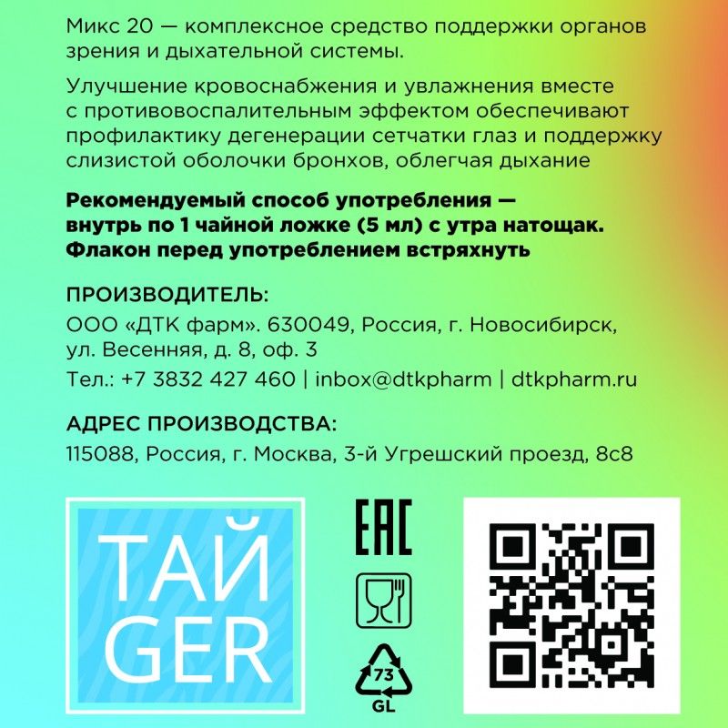 МИКС 20 ТАЙGER® рекомендуется для ежедневной поддержки органов зрения и дыхательной системы, ускорения восстановления после бронхитов, продления стадии ремиссии бронхиальной астмы, борьбы с синдромом сухого глаза и повышенной утомляемостью глаз.